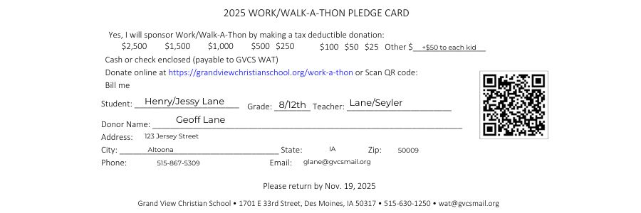 We aim to serve our community through hard work, make real connections and support our GVCS families financially. Pledges collected will support tuition assistance for students who might otherwise be unable to attend our awesome school. In addition, a portion of the funds raised will go towards a school project. This year’s projects are new bleachers for the gym located at the MS/HS campus and a digital checkout system for the Elementary library.